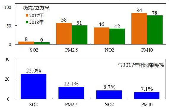 2018年,北京市PM2.5年平均浓度为51微克/立方米,较2017年同比下降12.1%。SO2、二氧化氮(NO2)、可吸入颗粒物(PM10)年均浓度分别为6微克/立方米、42微克/立方米、78微克/立方米,同比改善均较明显,较2017年下降幅度分别为25.0%、8.7%、7.1%。