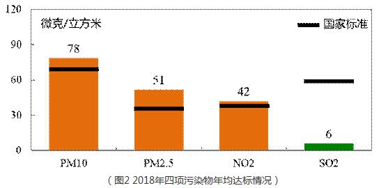 2018年,北京市SO2达到国家标准(60微克/立方米); NO2超过国家标准(40微克/立方米)5%;PM10超过国家标准(70微克/立方米)11%;PM2.5超过国家标准(35微克/立方米)46%,PM2.5仍是北京市大气主要污染物。
