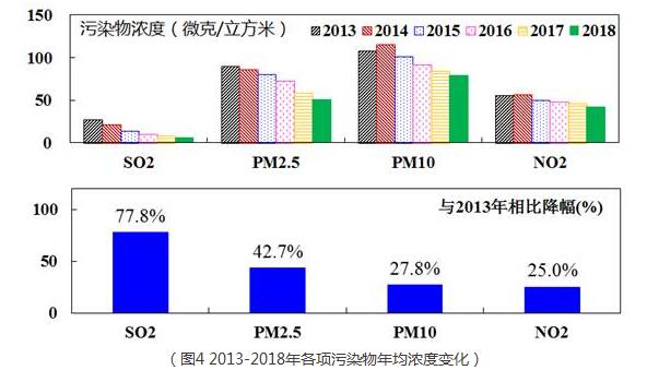 2018年与2013年相比,北京市主要污染物年均浓度均显著下降,SO2、PM2.5、PM10、NO2分别下降77.8%、42.7%、27.8%、25.0%;其中SO2下降幅度最大,连续两年浓度达到个位数。2018年与2015年相比,北京市主要污染物年均浓度均显著下降,SO2、PM2.5、PM10、NO2分别下降57.1%、37.0%、23.5%、16.0%。