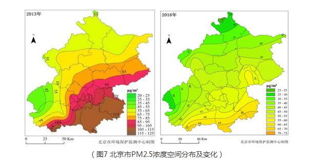 空间特征变化显示,2013-2018年,北京市各区域PM2.5浓度均显著下降;2018年总体空间分布仍为南高北低特征,但南北浓度差距持续减小。