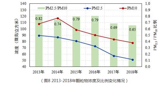 PM2.5占比变化显示,近年PM2.5在PM10中的占比呈逐步下降趋势,由2013年的0.82下降至2018年的0.65,体现出我市针对细颗粒物污染源的治理效果更为明显,同时也反映出粗颗粒物的改善幅度要小于细颗粒物。