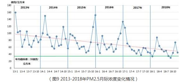 从月际变化上看,受气象条件波动影响,2018年3月和11月是污染水平明显偏高的月份;1月、8月和9月,PM2.5月均浓度分别为34、35和30微克/立方米,分别达到空气质量年评价标准。
