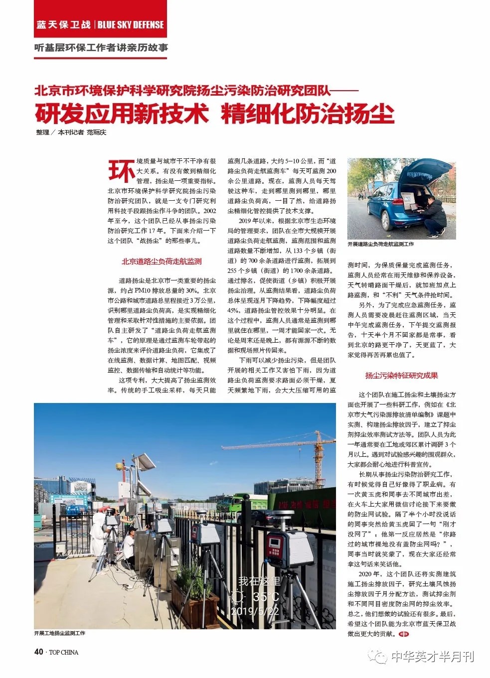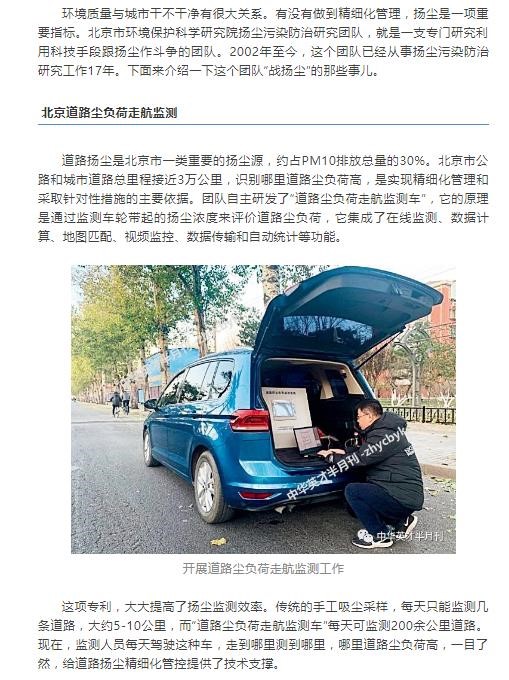 转自《中华英才》(第02期 总710期 2020.01.16)-北京市环境保护科学研究院扬尘污染防治研究团队——研发应用新技术 精细化防治扬尘