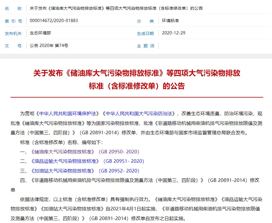 为贯彻《中华人民共和国环境保护法》《中华人民共和国大气污染防治法》,改善生态环境质量,防治环境污染,2020年12月28日,生态环境部与国家市场监督管理总局联合发布《储油库大气污染物排放标准》(GB 20950—2020)、《油品运输大气污染物排放标准》(GB 20951—2020)、《加油站大气污染物排放标准》(GB 20952—2020)三项国家大气污染物排放标准,标准自2021年4月1日起实施。