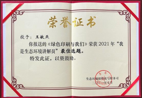 为全面贯彻落实党的十九大和十九届二中、三中、四中、五中全会精神,深入宣传习近平生态文明思想,大力弘扬生态文化和新时代科学家精神,广泛动员全社会运用科学思维、科学方法、科技成果,助力深入打好污染防治攻坚战,生态环境部于2021年5月面向全国举办“我是生态环境讲解员”活动。经个人申报及院长办公会评选,我院举荐大气所王敏燕高工参与该项活动,其“绿色印刷与我们”选题被市局推荐,经层层评选后获得“最佳选题”奖。