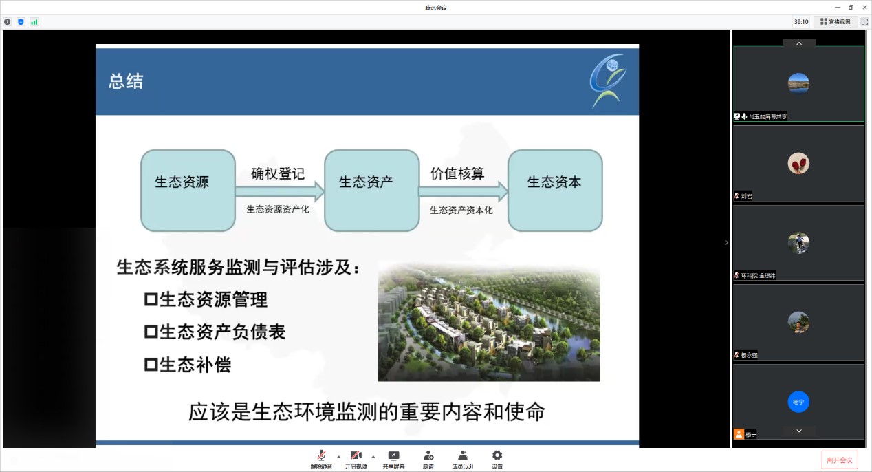 为加深对生态资产与生态系统服务理论的理解,增进GEP核算与生态产品价值实现机制最新政策需求与实践的认知,2022年7月28日,环科院生态所邀请中国科学院地理科学与资源研究所肖玉副研究员做了题为“生态资产与生态系统服务理论与实践”的学术报告。会议由刘春兰副院长主持,院内从事相关工作的科研人员60余人参加了此次交流。