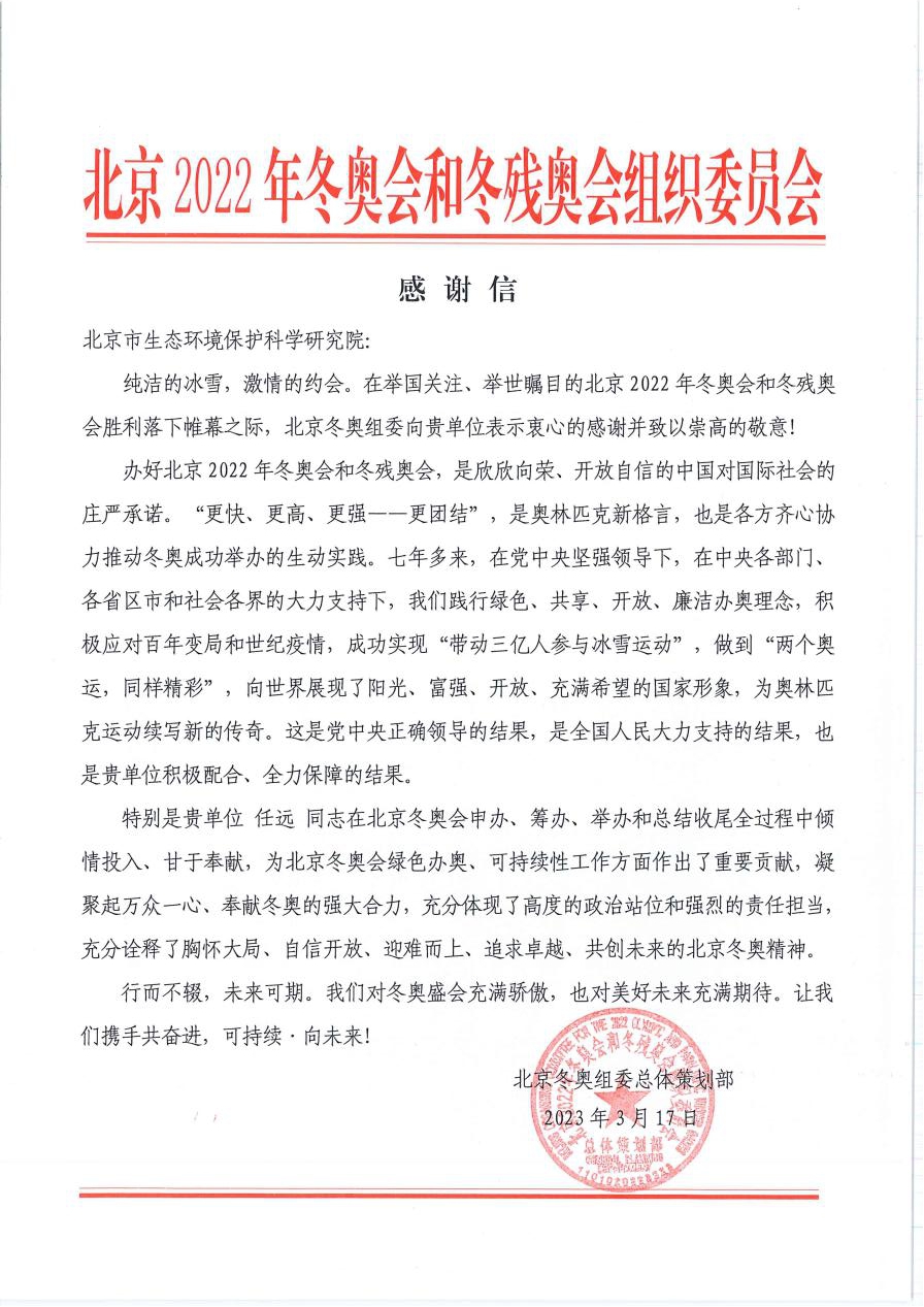 近日,北京市环科院收到来自北京冬奥组委总体策划部的感谢信,信中感谢了北京市环科院对冬奥会所作出的贡献。特别感谢了绿色智慧中心任远同志在北京冬奥会申办、筹办、举办和总结收尾全过程中倾情投入、甘于奉献,在为北京冬奥会绿色办奥、可持续性工作中,体现了高度的政治站位和强烈的责任担当,诠释了胸怀大局、自信开放、迎难而上、追求卓越、共创未来的北京冬奥精神。
