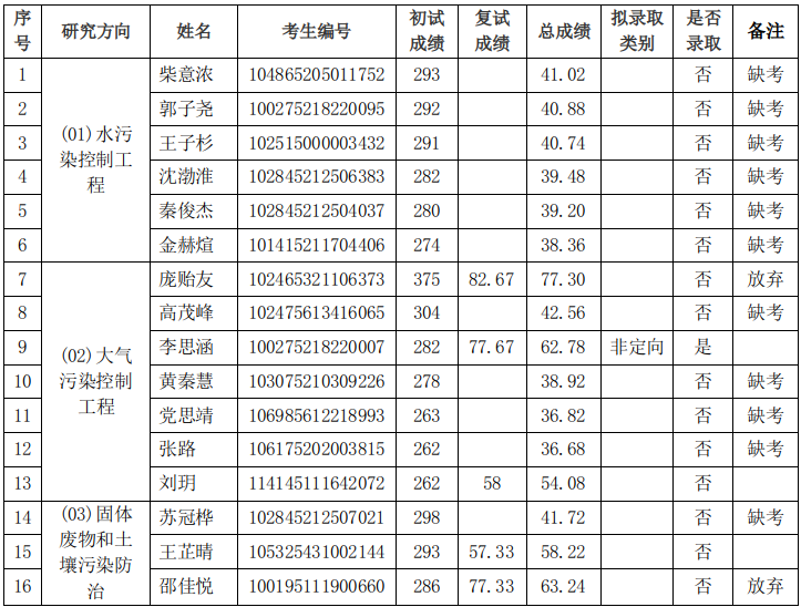 市环科院2025年硕士研究生招生调剂考生总成绩及拟录取名单公示(第一轮)